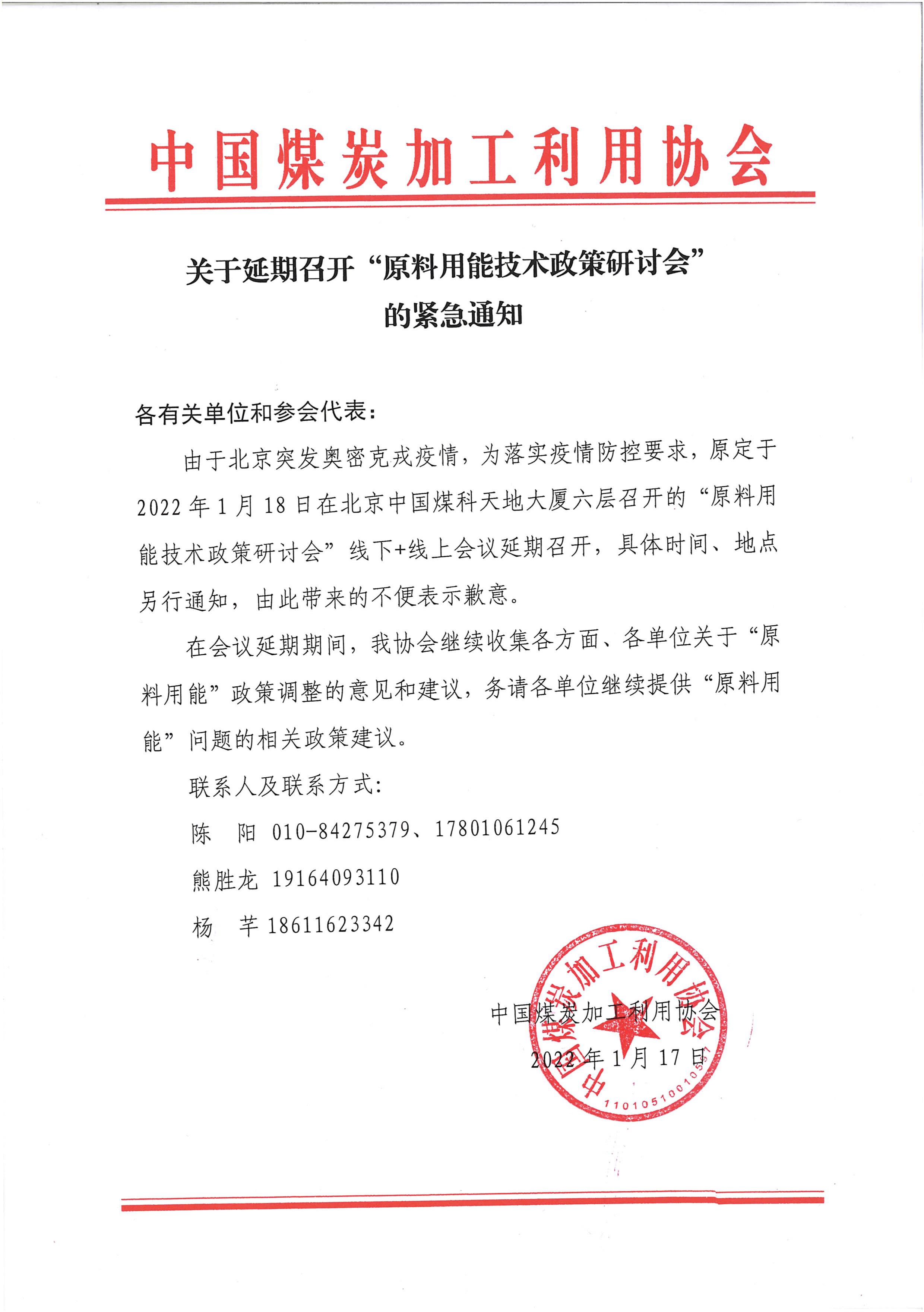 关于延期召开“原料用能技术政策研讨会”的紧急通知