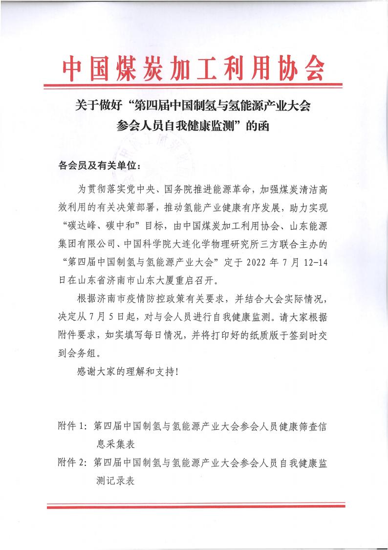 关于做好“第四届中国制氢与氢能源产业大会参会人员自我健康监测”的函