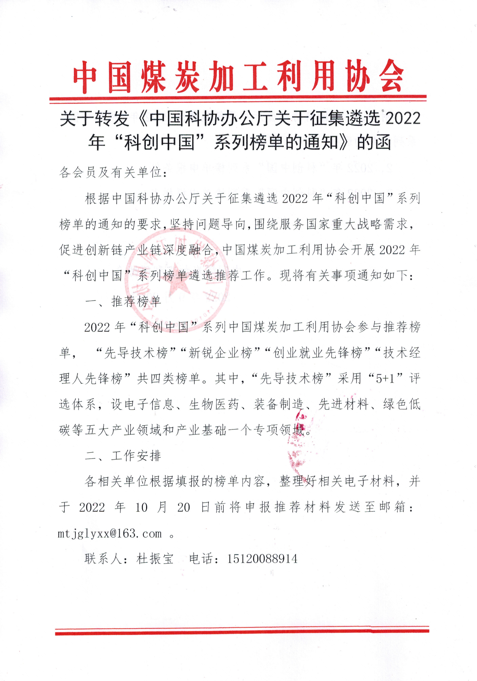 关于转发《中国科协办公厅关于征集遴选2022年“科创中国”系列榜单的通知》的函