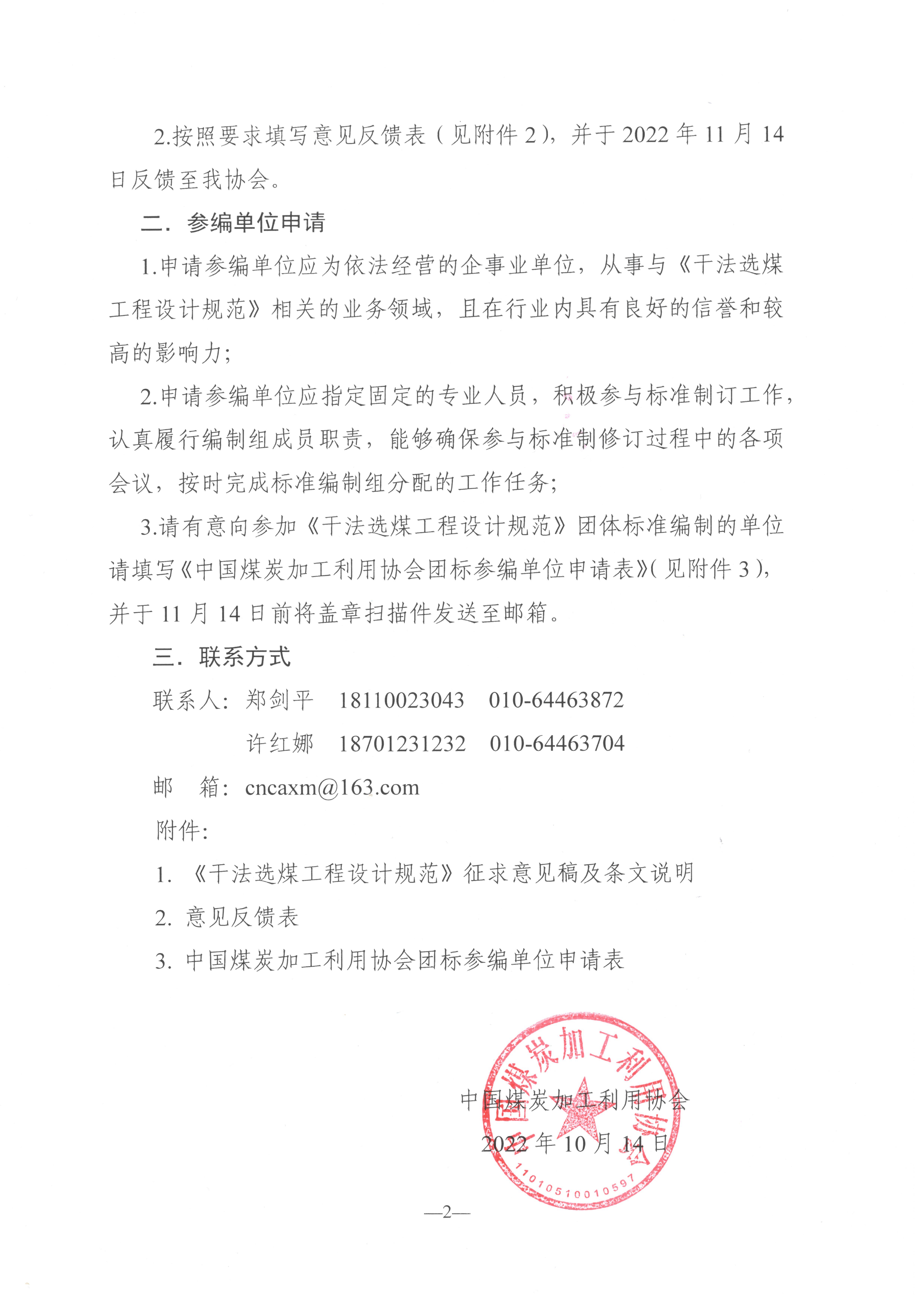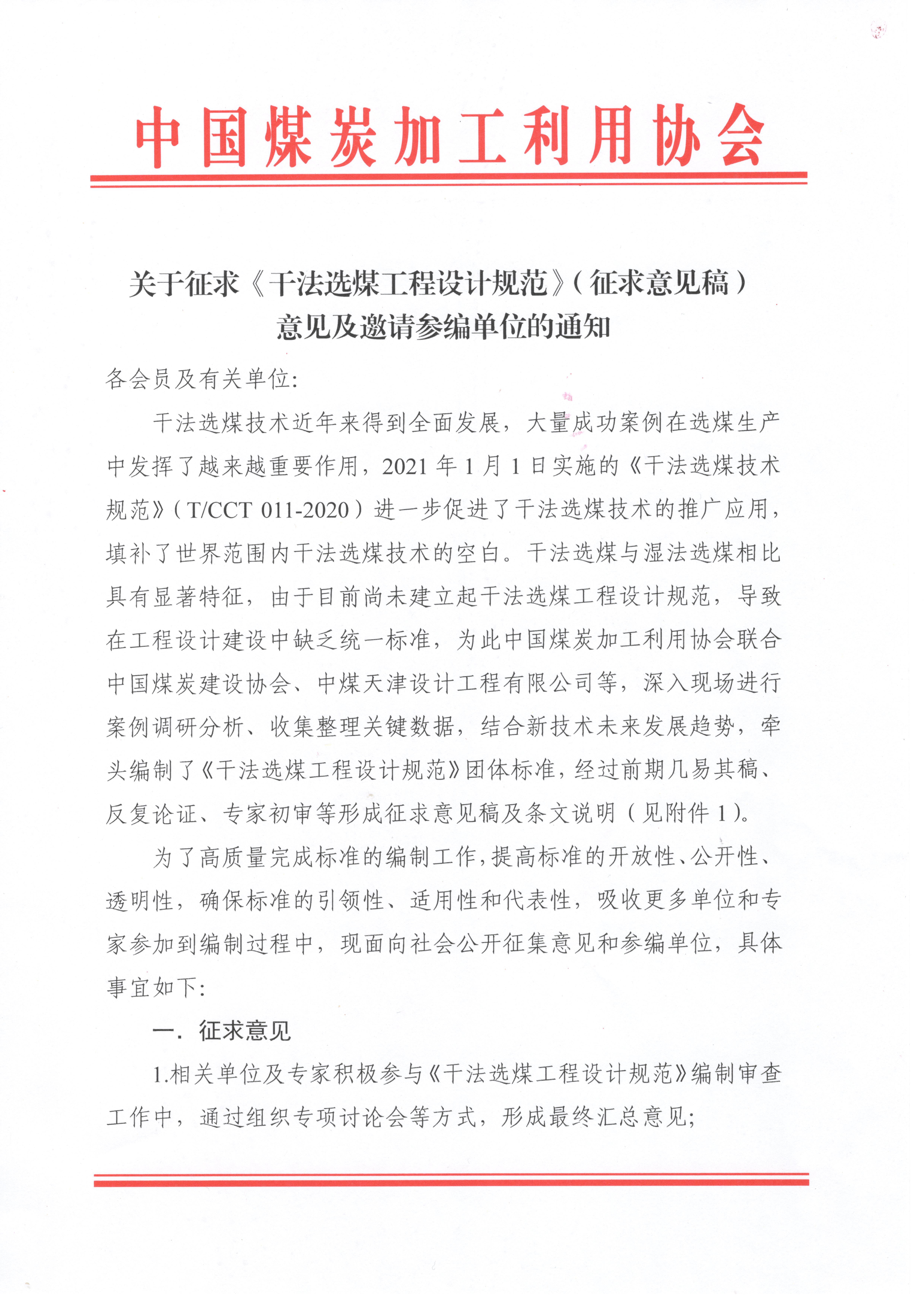 关于征求《干法选煤工程设计规范》(征求意见稿)意见及邀请参编单位的通知