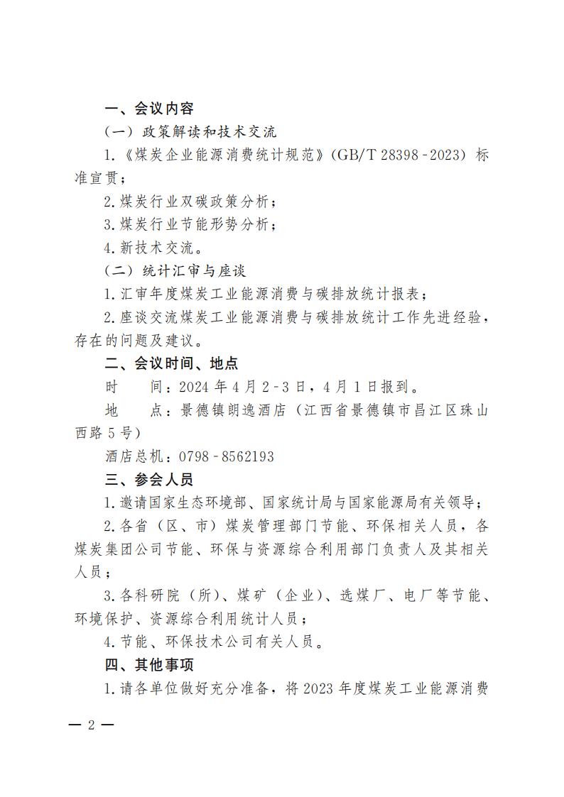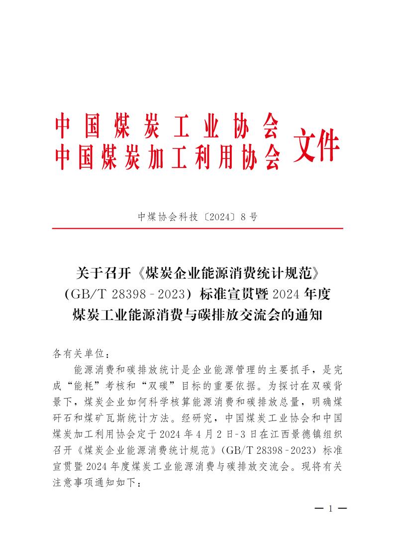 关于召开《煤炭企业能源消费统计规范》(GB/T 28398-2023)标准宣贯暨2024年度煤炭工业能源消费与碳排放交流会的通知