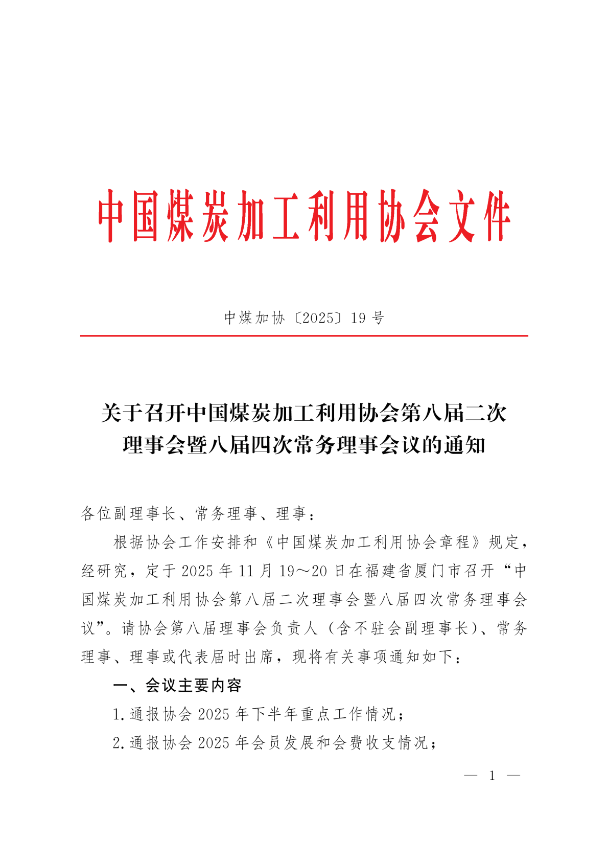 关于召开中国煤炭加工利用协会第八届二次理事会暨八届四次常务理事会议的通知