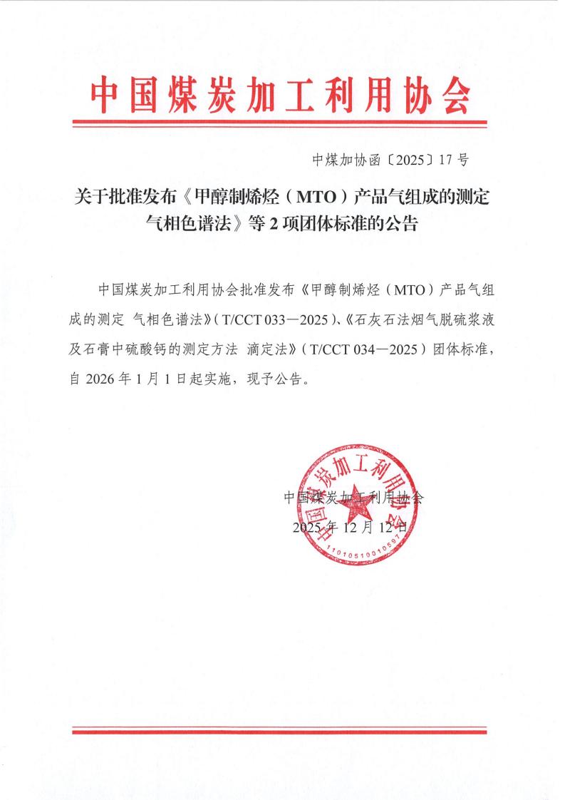 关于批准发布《甲醇制烯烃(MTO)产品气组成的测定气相色谱法》等2项团体标准的公告
