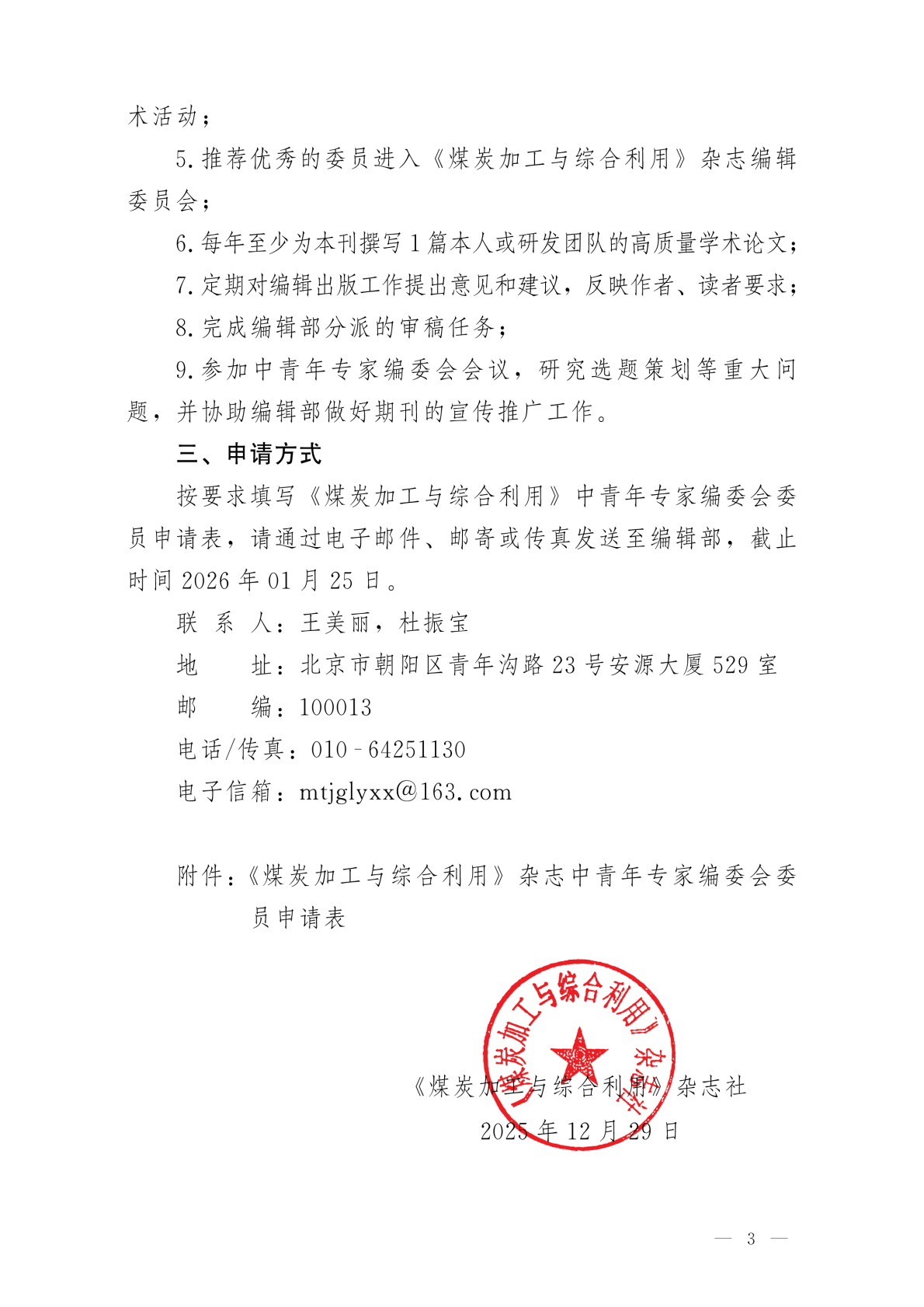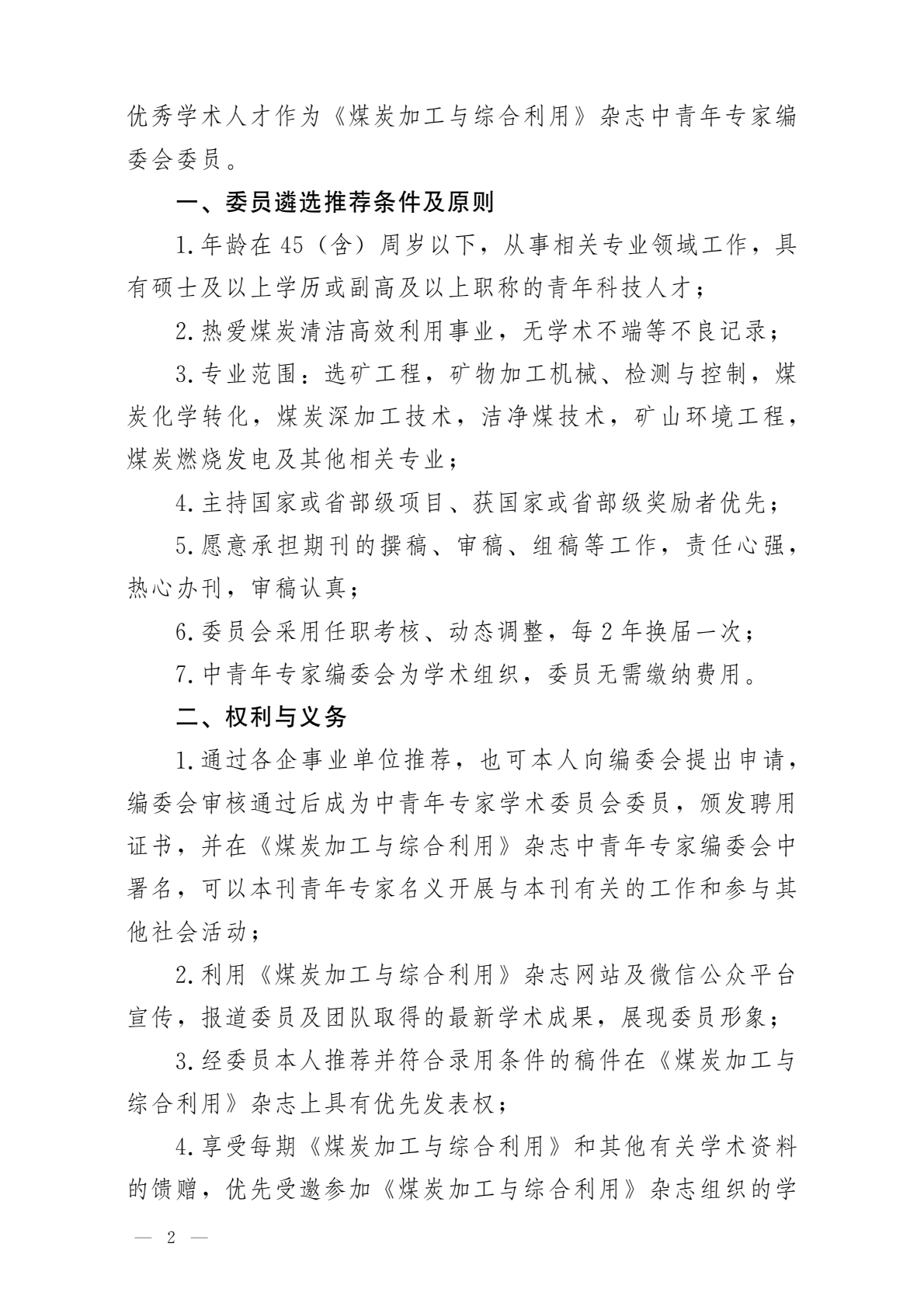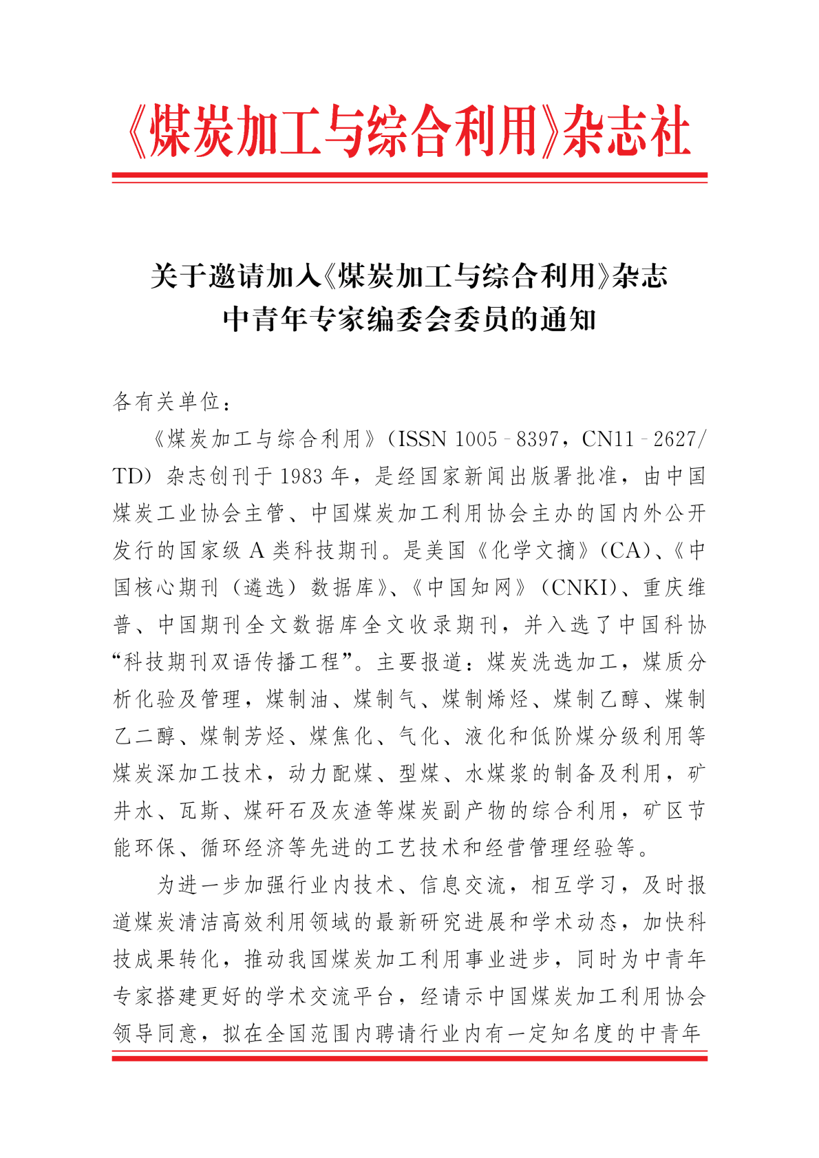关于邀请加入《煤炭加工与综合利用》杂志中青年专家编委会委员的通知