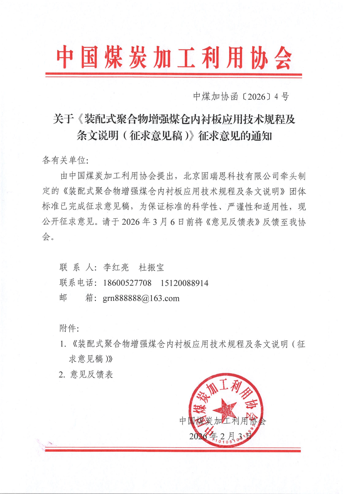 关于《装配式聚合物增强煤仓内衬板应用技术规程及条文说明(征求意见稿)》征求意见的通知