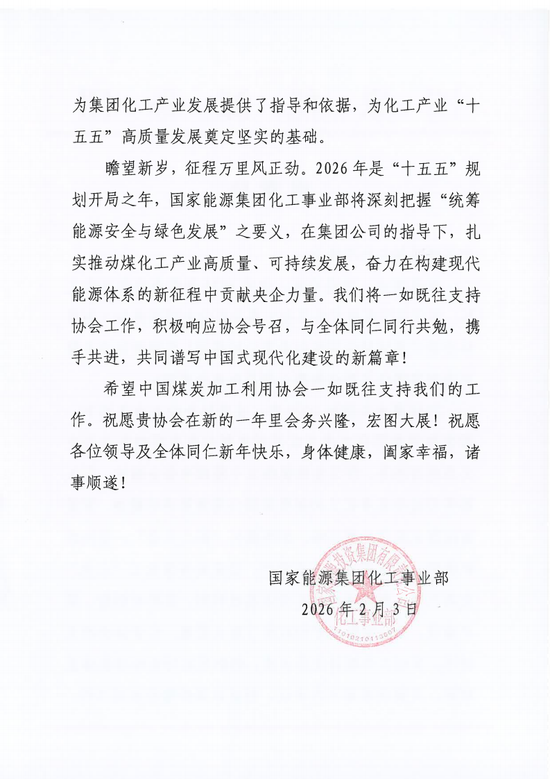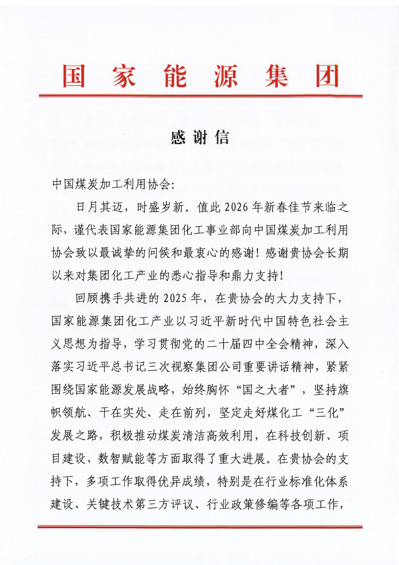 国家能源集团向中国煤炭加工利用协会发来感谢信