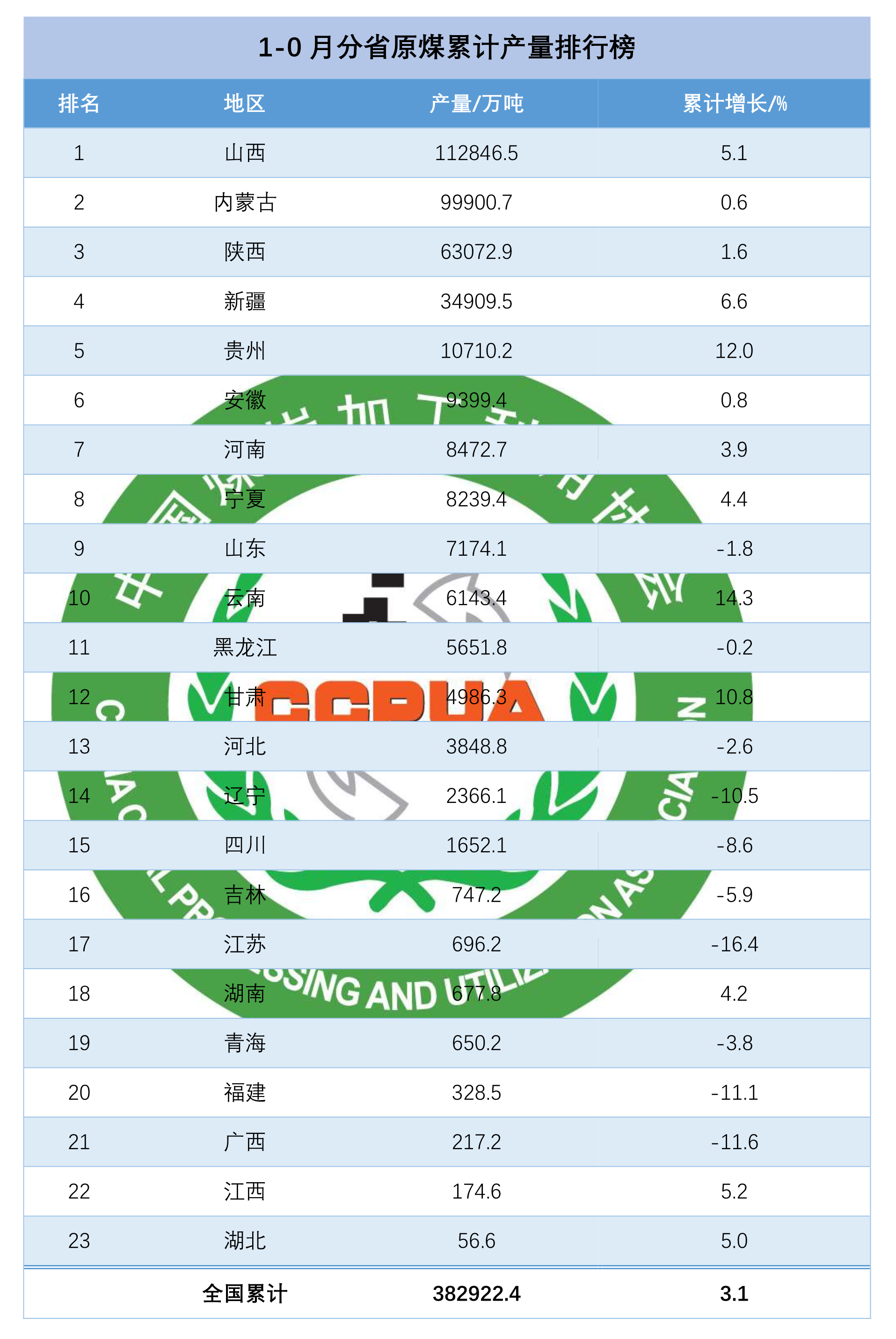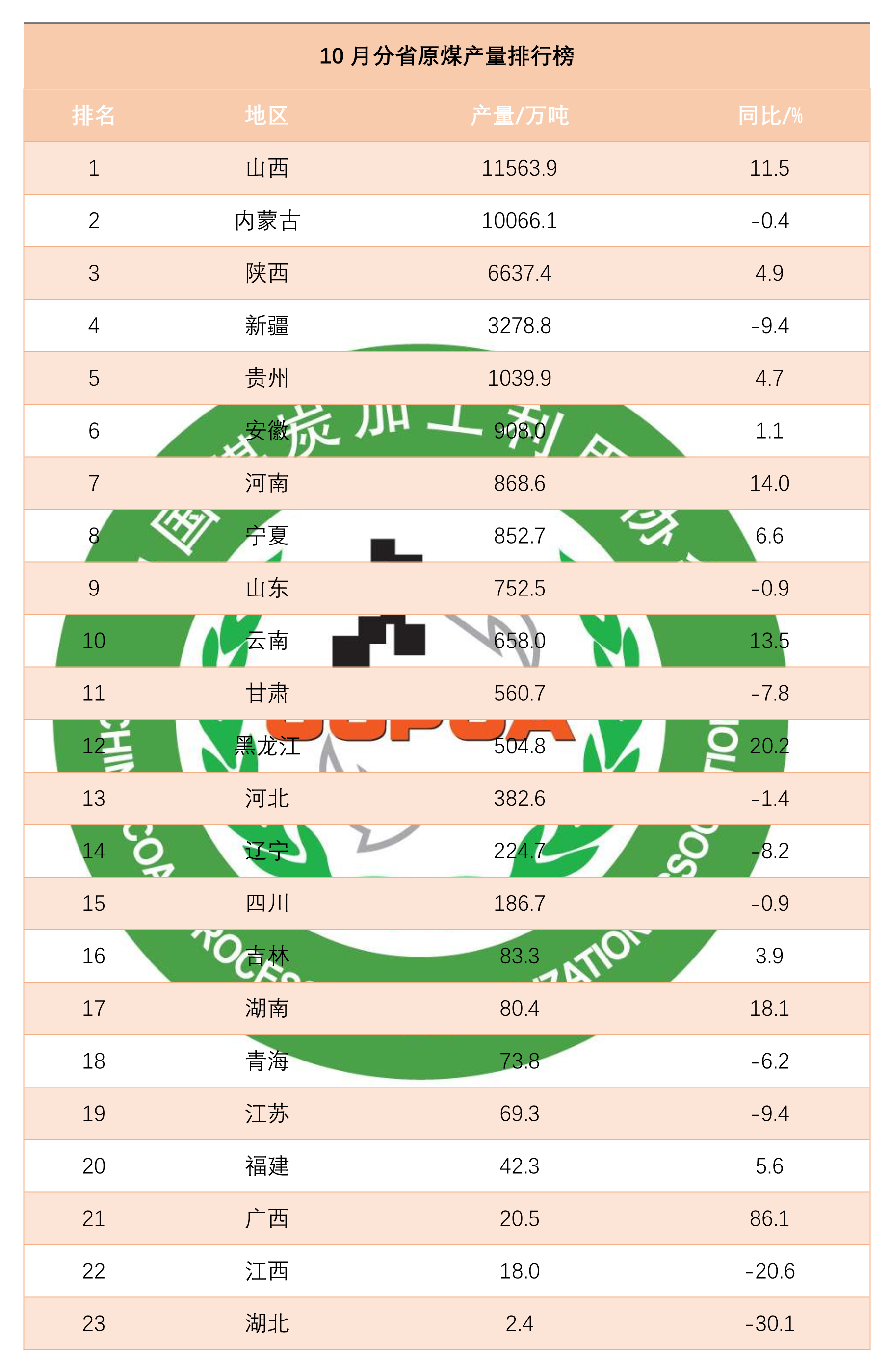 从分省数据来看,1-10月山西、内蒙古、陕西、新疆、贵州原煤产量累计同比分别增长5.1%、0.6%、1.6%、6.6%和12.0%。