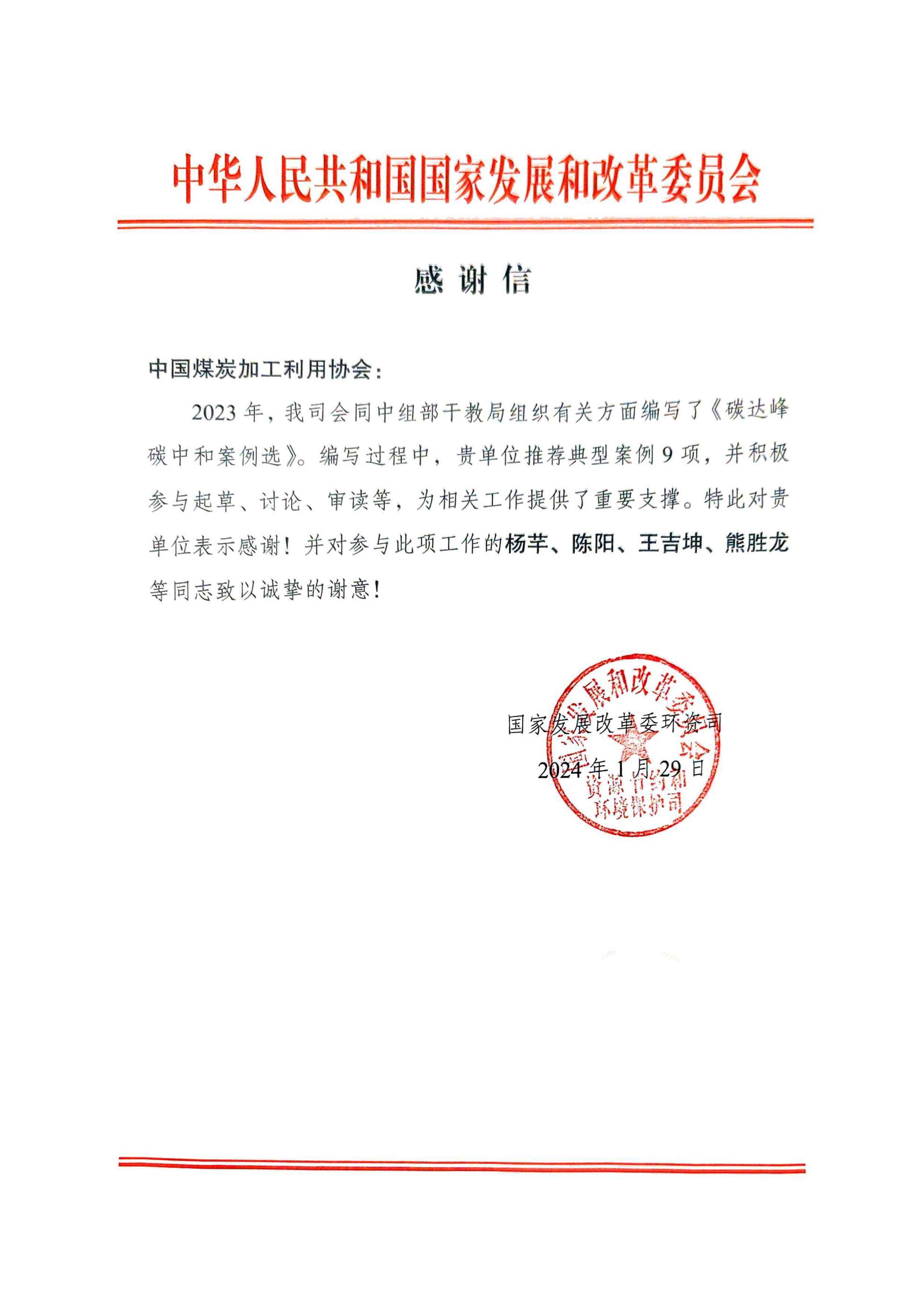 国家发展改革委向中国煤炭加工利用协会发来感谢信