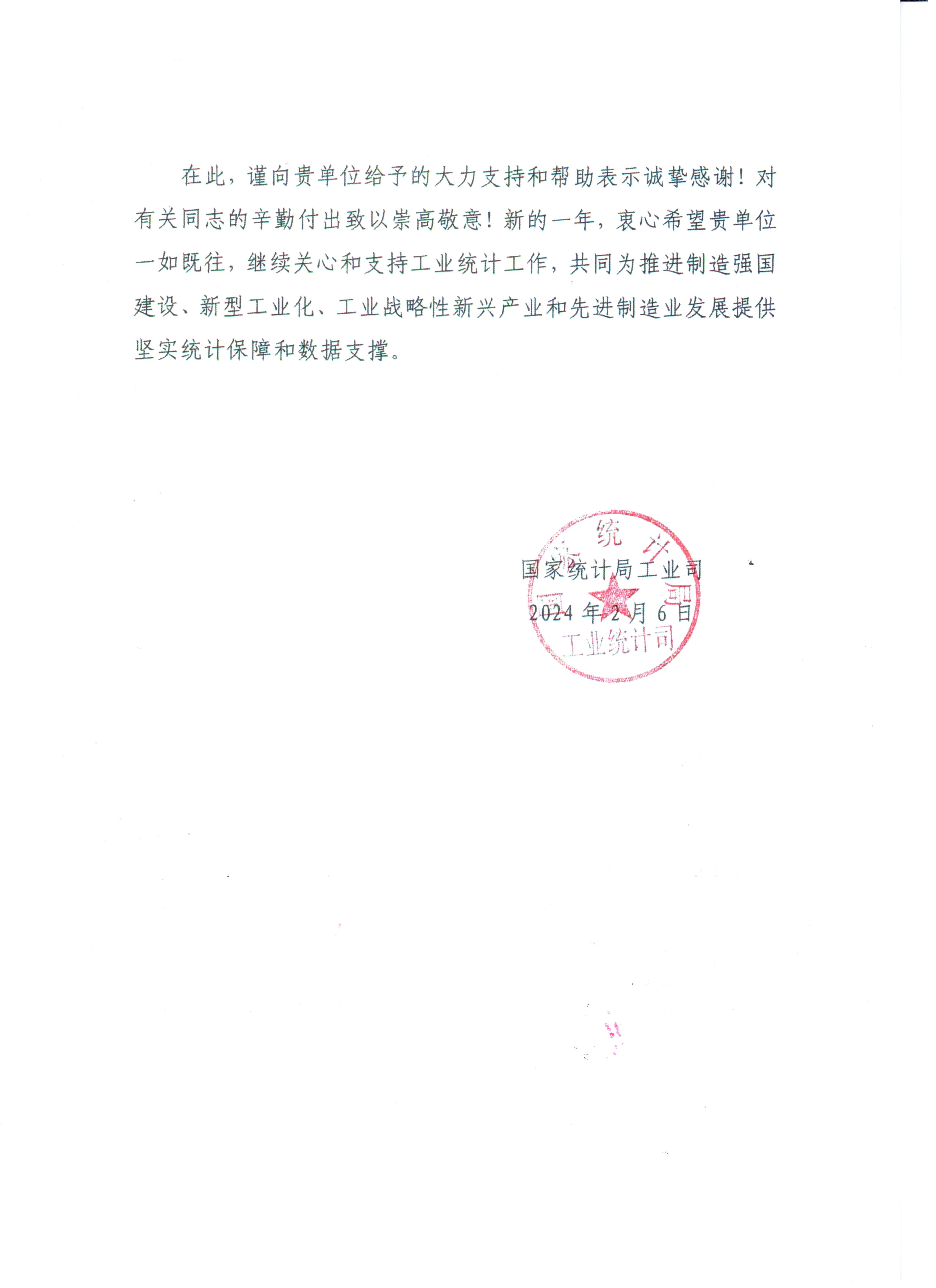 国家统计局工业司向中国煤炭加工利用协会发来感谢信