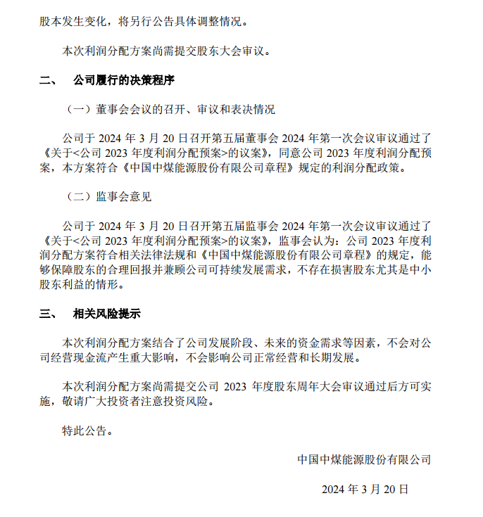 中煤能源发布2023年年度利润分配方案公告。中国中煤能源股份有限公司 2023 年度合并财务报表实现归属于上市公司股东的净利润为人民币 195.34 亿元,基本每股收益为人民币 1.47 元。截至报告期末,公司可供股东分配利润为人民币 329.42 亿元(母公司报表)。公司拟向全体股东每股派发现金红利 0.442 元(含税)。截至 2023 年 12 月31 日,公司总股本 13,258,663,400 股,以此计算合计拟派发现金红利 5,860,214,700元(含税)。本年度公司现金分红比例为 30%。