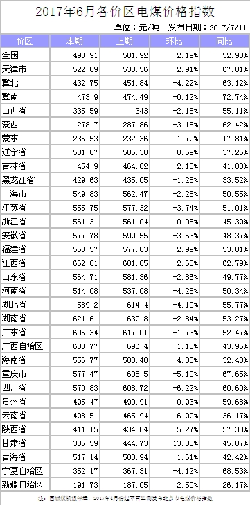 7月11日,国家发改委网站公布了2017年6月份全国电煤价格指数。6月份全国电煤价格指数为490.91元/吨,较5月下降11.01元/吨,跌幅为2.19%,连续第六个月下跌,累计下行44元/吨。