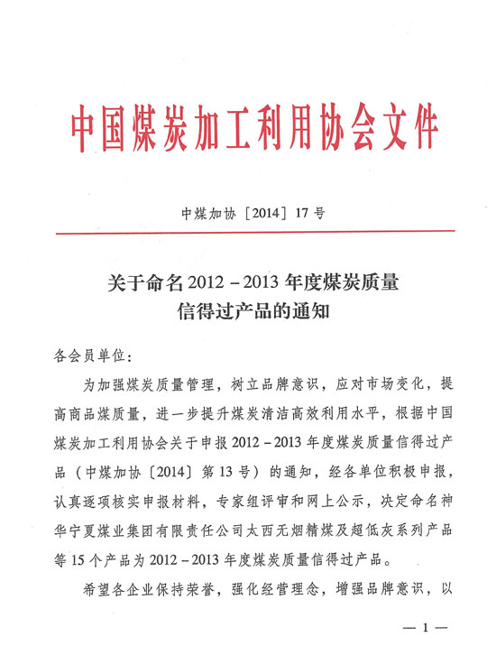 关于命名2012-2013年度煤炭质量信得过产品的通知