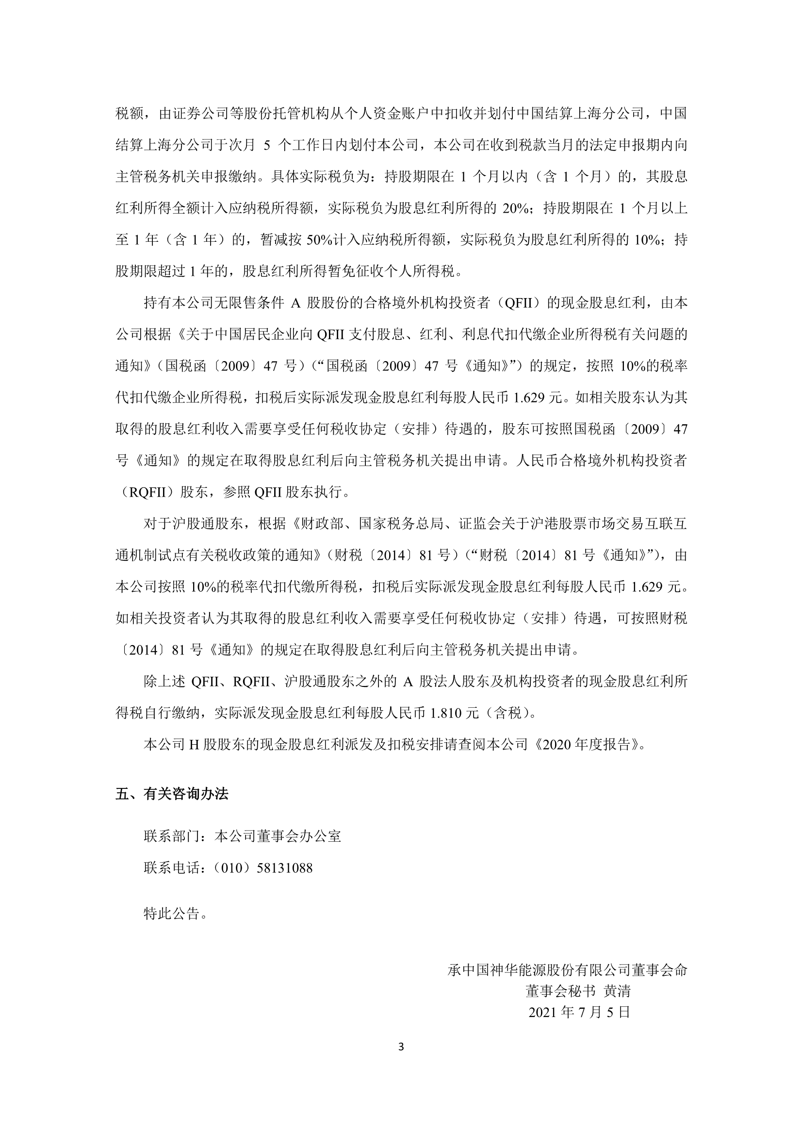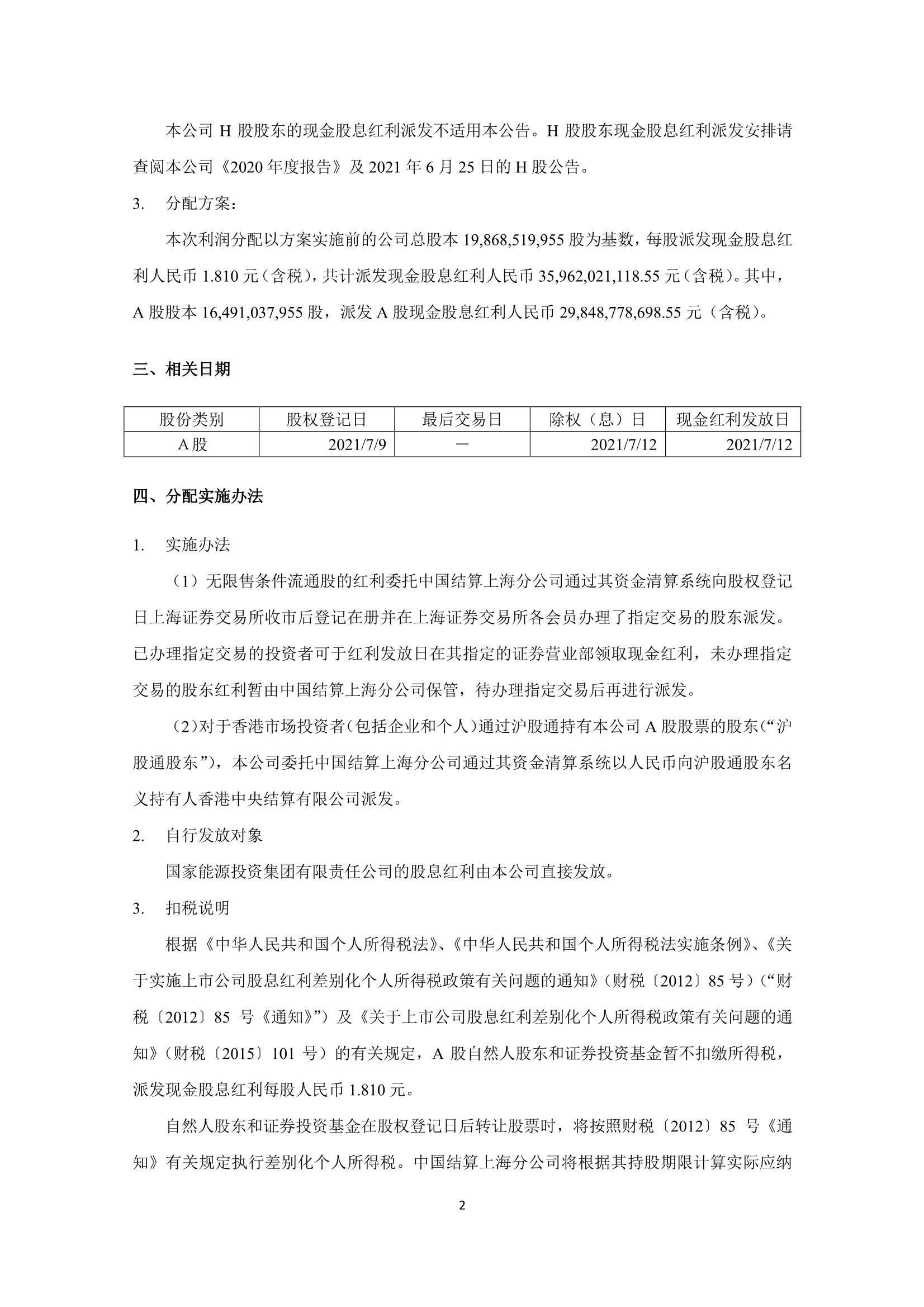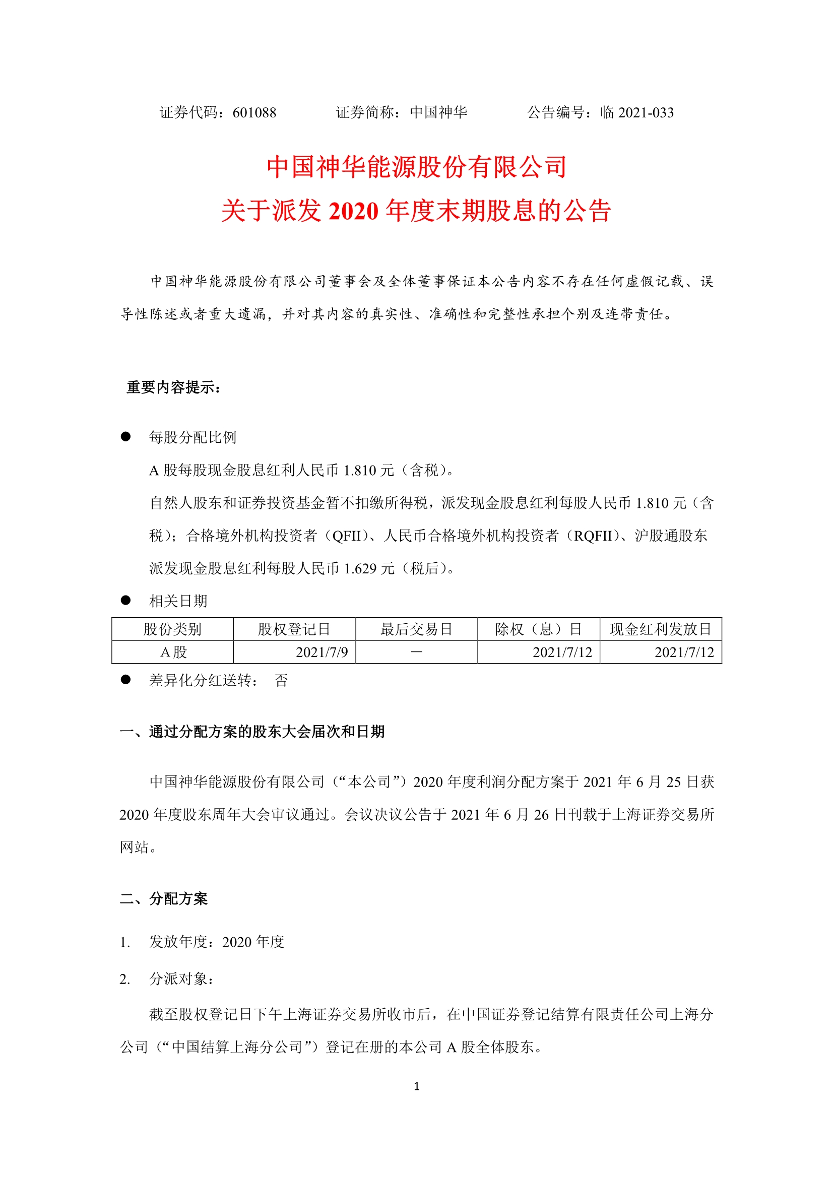 发钱啦!中国神华关于派发2020年度末期股息的公告