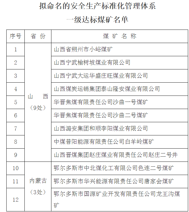 按照《煤矿安全生产标准化管理体系考核定级办法(试行)》和《煤矿安全生产标准化管理体系基本要求及评分方法(试行)》(煤安监行管〔2020〕16号)的有关规定,经资料审查和现场检查考核,现有12处煤矿达到安全生产标准化管理体系一级标准,现予以公示,接受社会监督。公示期间,如发现申报煤矿存在瞒报事故、弄虚作假等违法违规行为的,将依规定取消其申报资格。