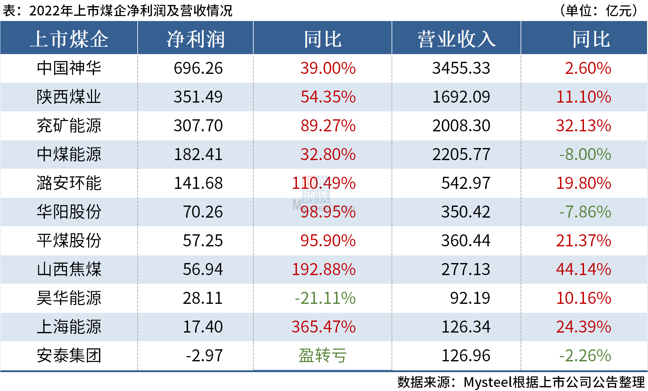 11家上市煤企公布2022年业绩,超八成净利润增长