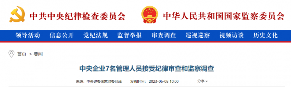 中央纪委国家监委网站6月8日消息,日前,中央企业7名管理人员正接受纪律审查和监察调查,现通报如下: