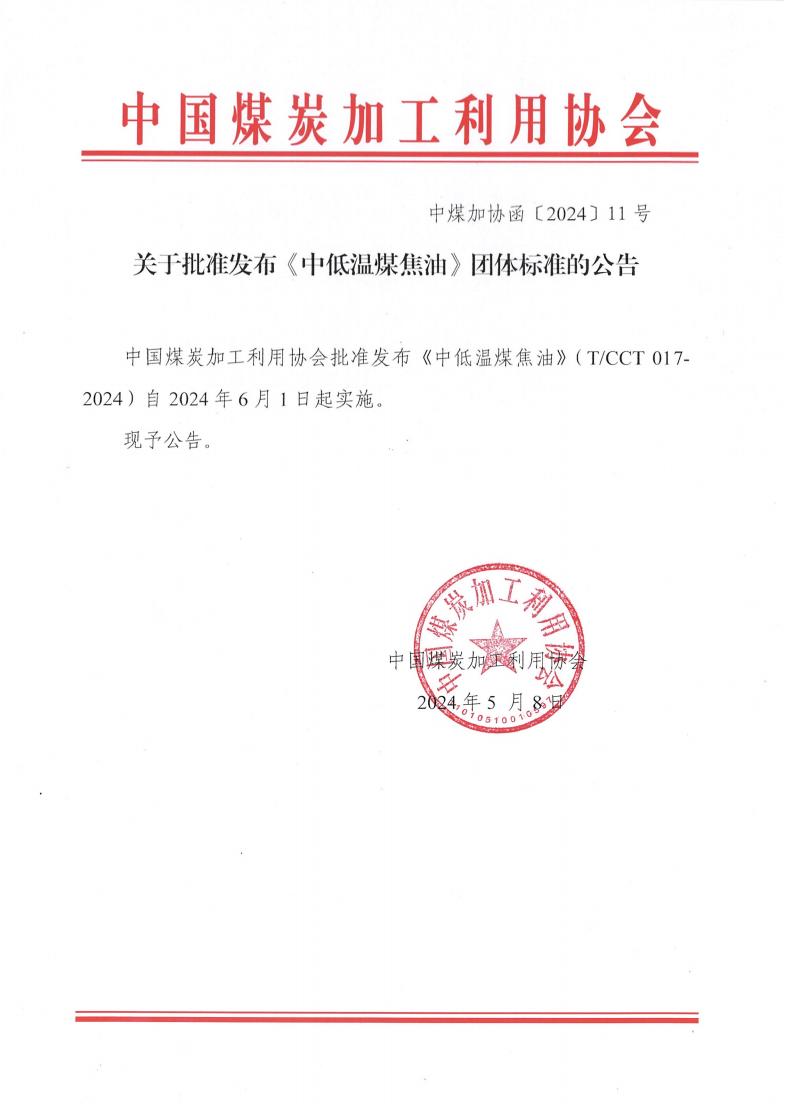 关于批准发布《中低温煤焦油》团体标准的公告