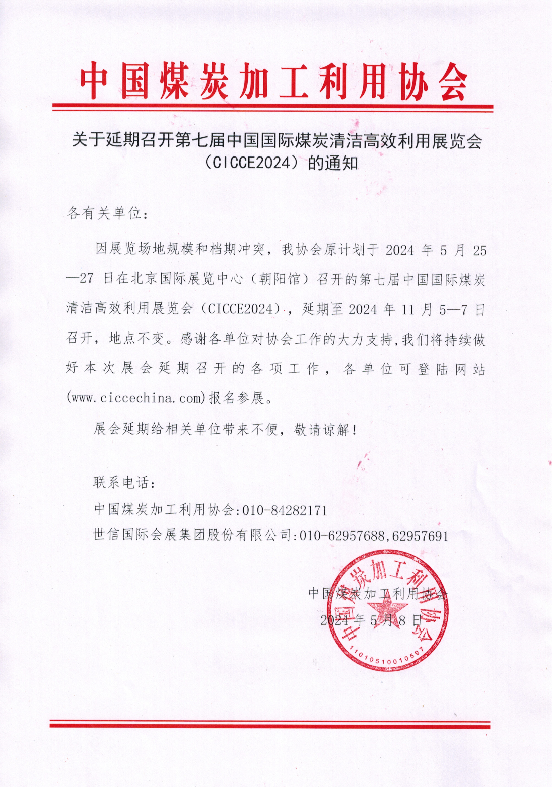 关于延期召开第七届中国国际煤炭清洁高效利用展览会(CICCE2024)的通知